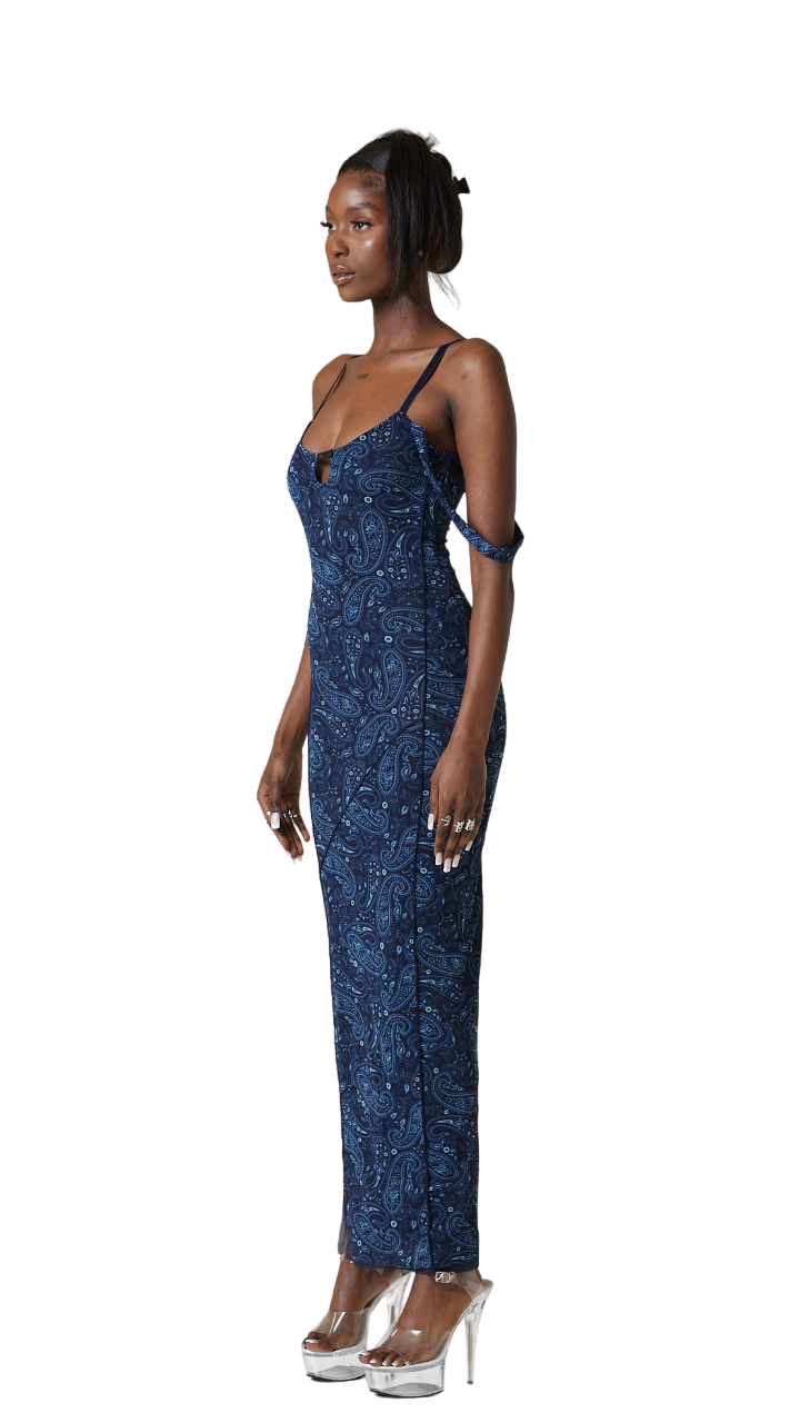 Double lined mesh dress in printed paisley blue. Cami vest. Low scoop neckline. Open keyhole chest with button hook. Low scoop back. Adjustable straps for low/high coverage. Panelling feature. Outer seaming. Loop arm wing. Side leg split. Good stretch. Model is wearing small.