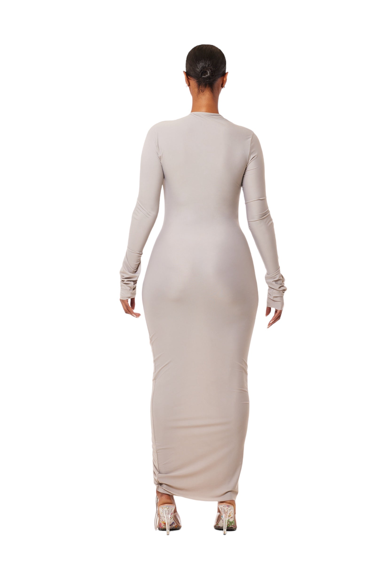 Slinky maxi dress in a relaxed sheek grey. Low turtle neckline. Hook & eye closuring. Elegantly raw cut. Extra long sleeves for added flair. Side boob exposure for a sultry look. Ruched detailing. Inverted & curved panelling featuring a knitted drawstring cord with a stunning gun metal toggle to finish. Dress can be adjusted to a shorter length or to an asymmetric style with more leg exposure for a sexy twist. Constructed in silhouette snatching material. Good stretch. Model is wearing small.