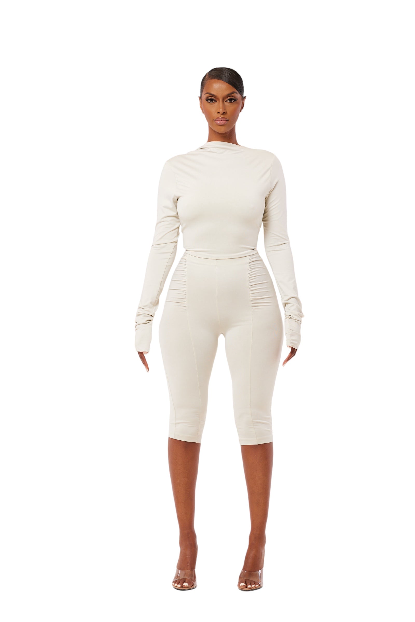 Galvanising slinky leggings in champagne silver. Double lined. Front and back panelling. Ruched detailing. Constructed with a figure holding fabric. An elasticated snatch-in waistband to cinch & grip to the waist. Knee length. Coordinate with the Laneur top for a soft seamless look. Good stretch. Model is wearing small.